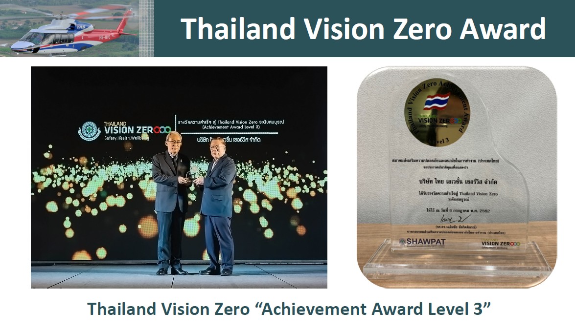 Thai Aviation services joined the Vision Zero campaign to strive towards a world of work without accidents and illness and received Thailand Vision Zero Achievement Award (Level 3) From Safety and Health at Work Promotion Association (Thailand): SHAWPAT on July 6, 2019, at Thailand Safety Week Exhibition 2019, Bangkok International Trade Exhibition Centre (BITEC).